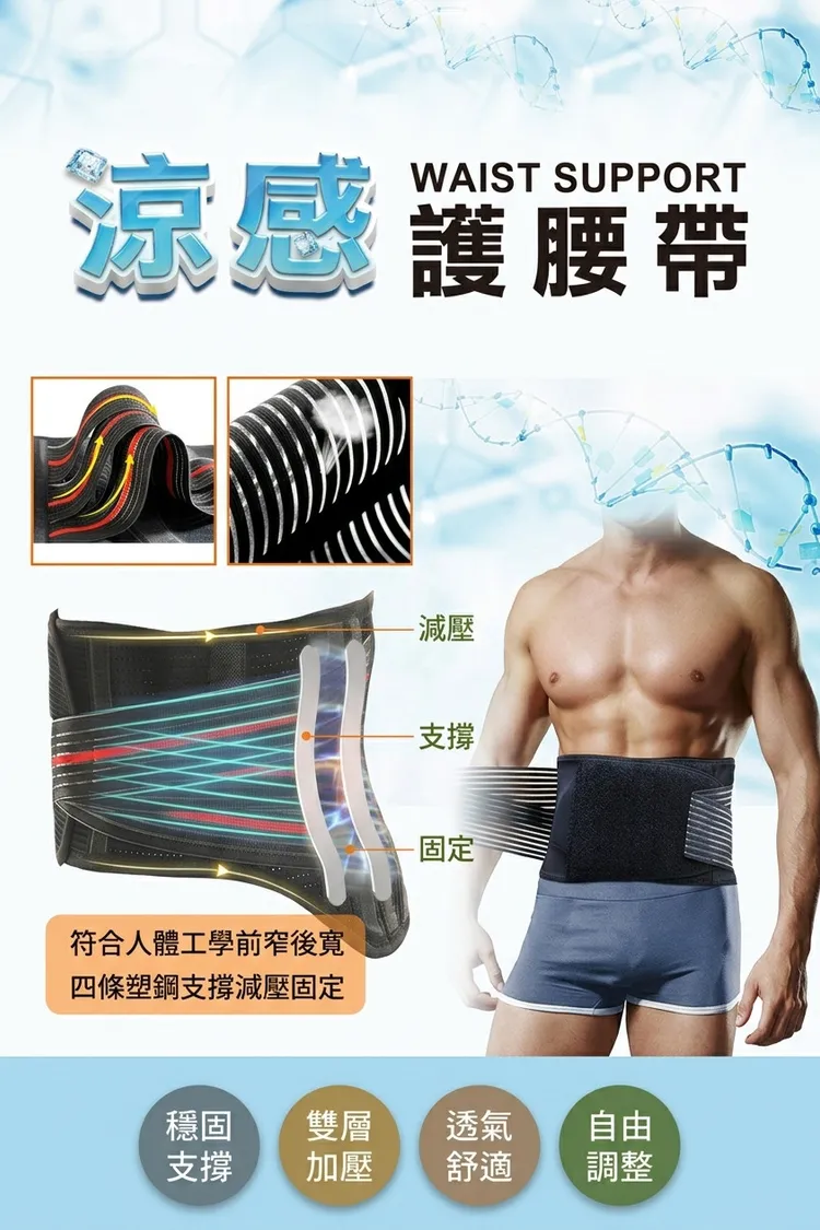 採用透氣涼感黑網布/背部4支塑鋼條支撐,保護腰部/材質輕薄透氣/雙層加壓包覆性佳