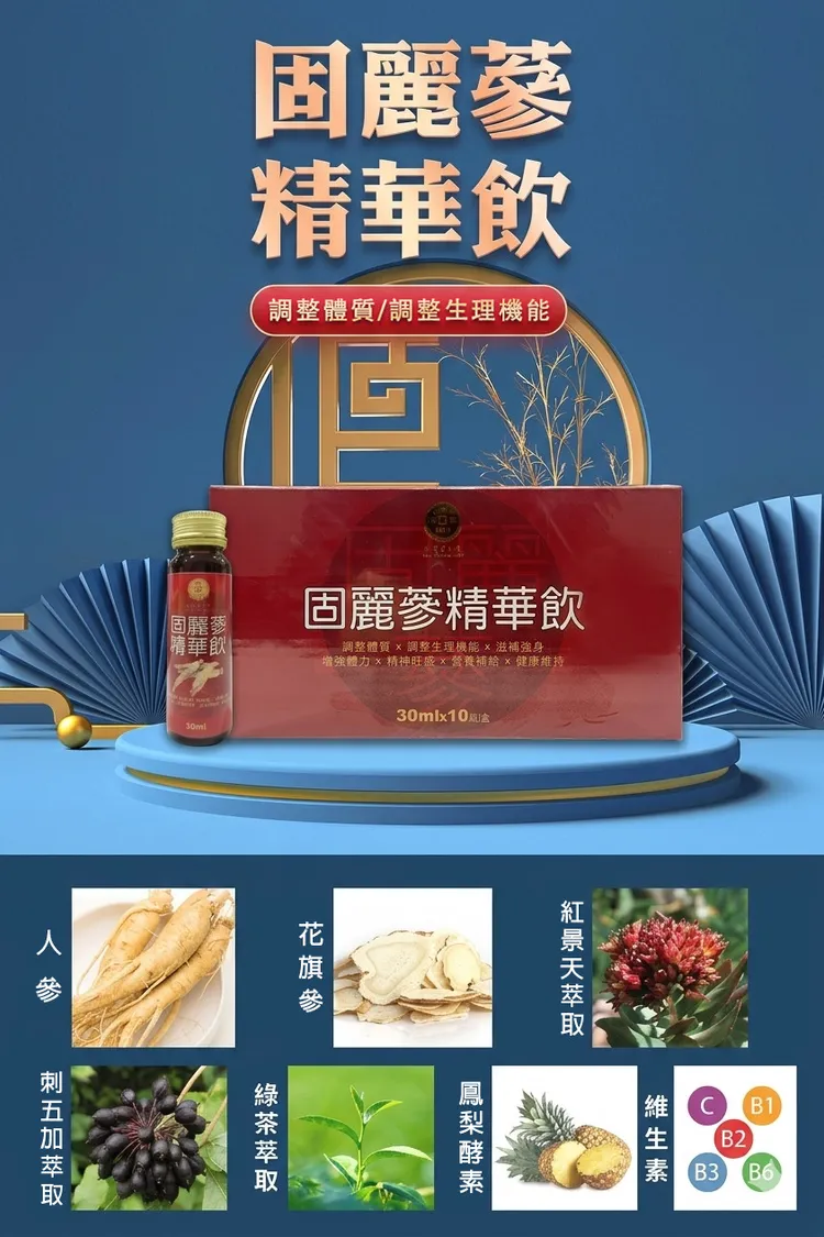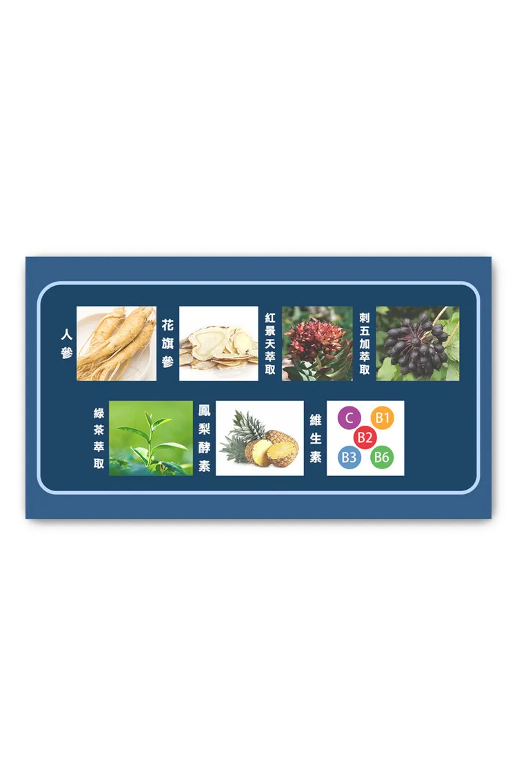 人蔘萃取物/花旗蔘/紅景天萃取/刺五加萃取/綠茶萃取/鳳梨酵素/維生素C/維生素B1、B2、B3、B6