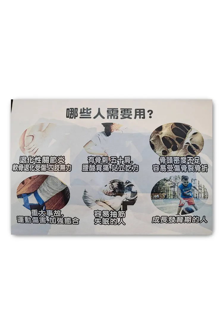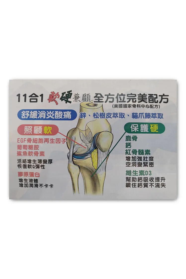鹿茸生長因子/鹿骨粉/非變性二型膠原蛋白UC-II/碳酸鈣/葡萄糖胺/鯊魚軟骨素/松樹皮/貓爪藤/豚骨精髓/鋅/維生素D