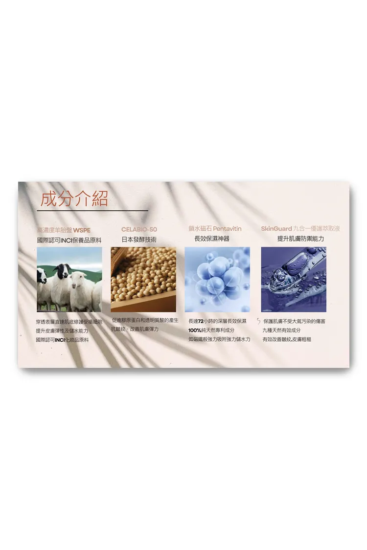 國際INCI認證 核心成分:高效鎖水磁石 日本專利-Celabio 小分子羊胎素 九合一優護萃取液 棕櫚硒四肽及玻尿酸