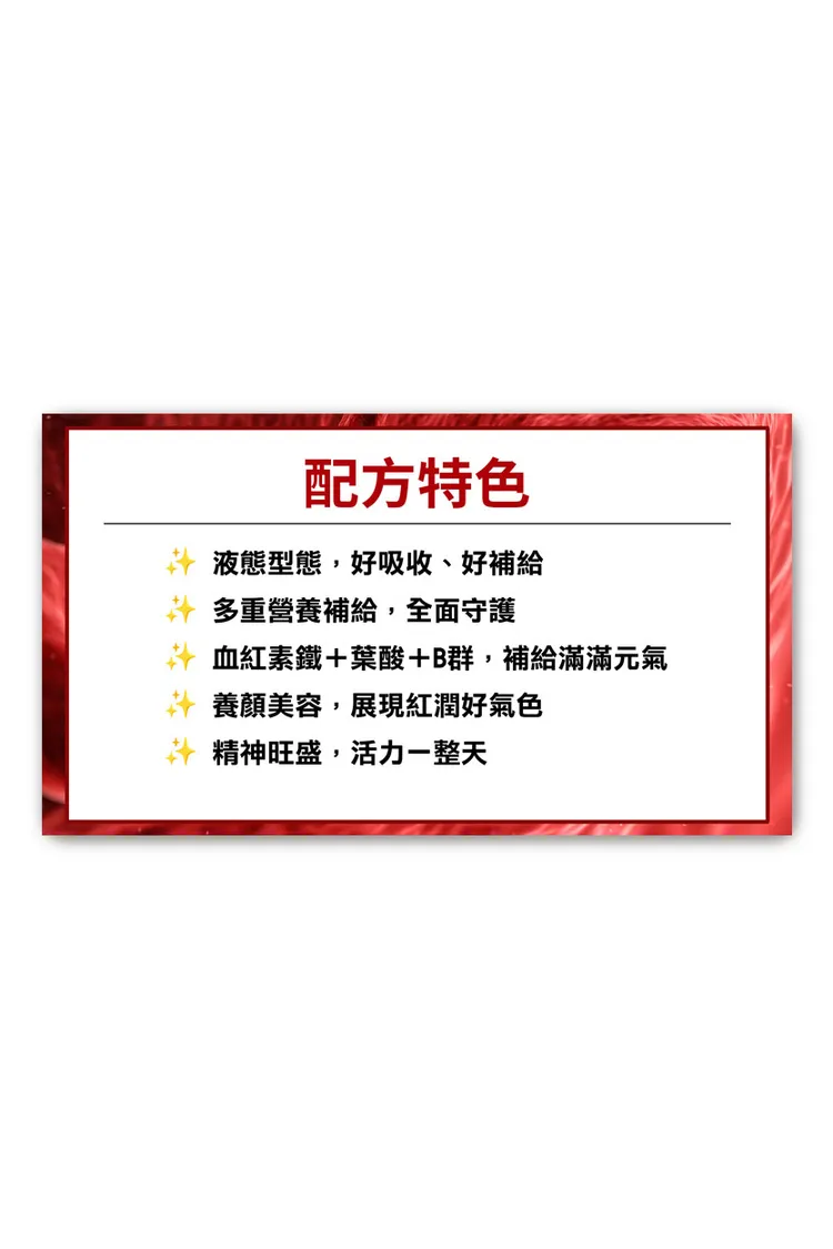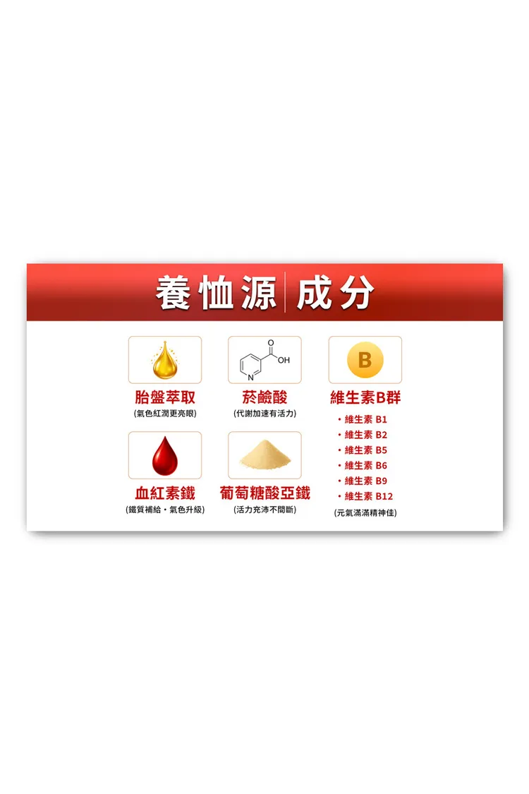 胎盤萃取、血紅素鐵、葡萄糖酸亞鐵、泛酸鈣、葉酸、菸鹼酸、維生素B1/B2/B6/B12