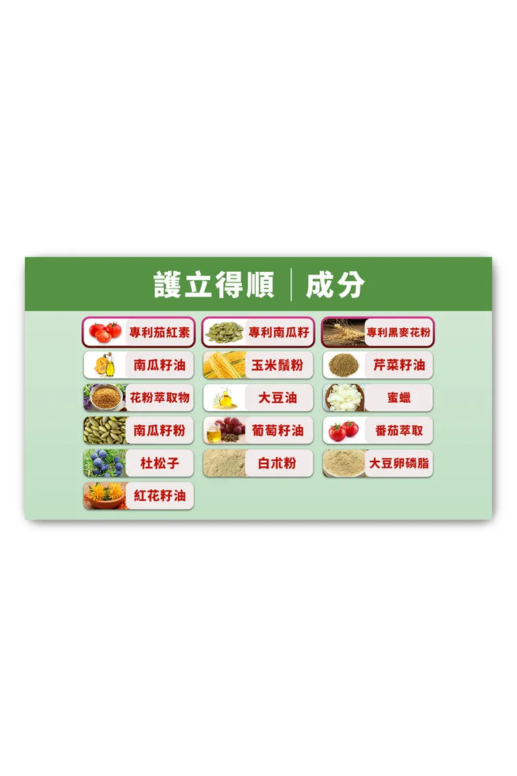 南瓜籽油.花粉萃取物.南瓜籽粉.杜松子.紅花籽油.玉米鬚粉.大豆油.葡萄籽油.白朮粉.芹菜籽油.蜜蠟.番茄萃取.大豆卵磷脂
