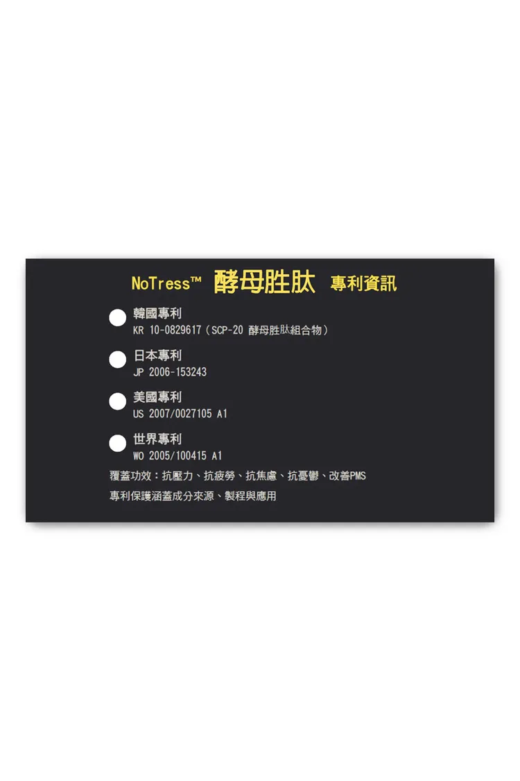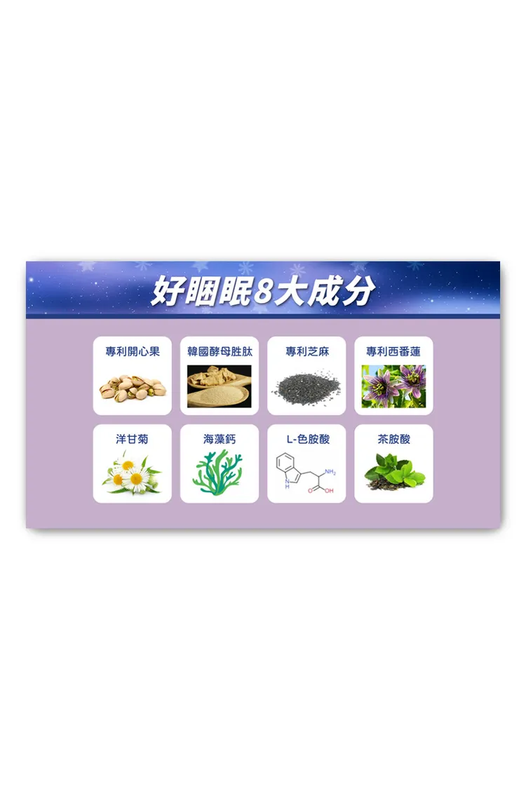 專利開心果、韓國酵母胜肽、專利芝麻、專利西番蓮、洋甘菊、海藻鈣、L-色胺酸、茶胺酸