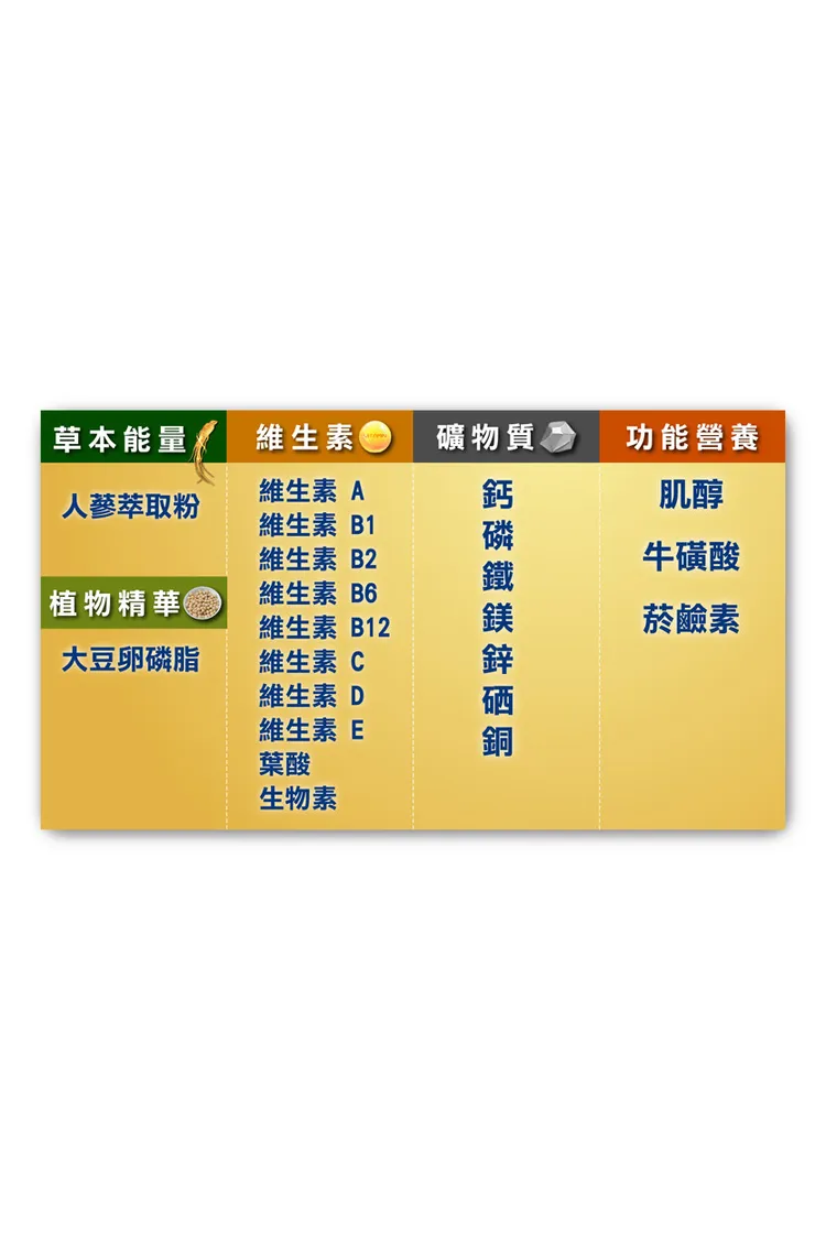 人蔘萃取粉/大豆卵磷脂/維生素A.B1.B2.B6.B12.C.D.E/鈣.磷.鐵.鎂.鋅.硒.銅/肌醇/牛磺酸/菸鹼素/葉酸/生物素