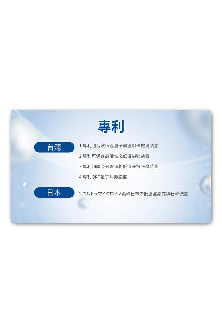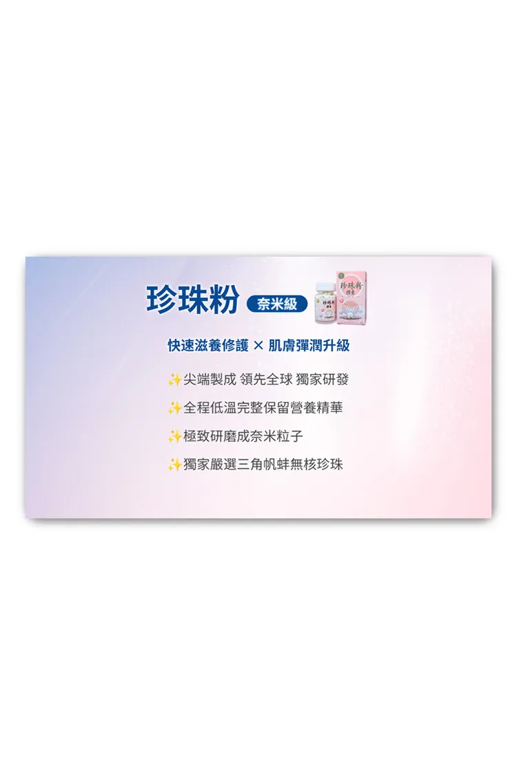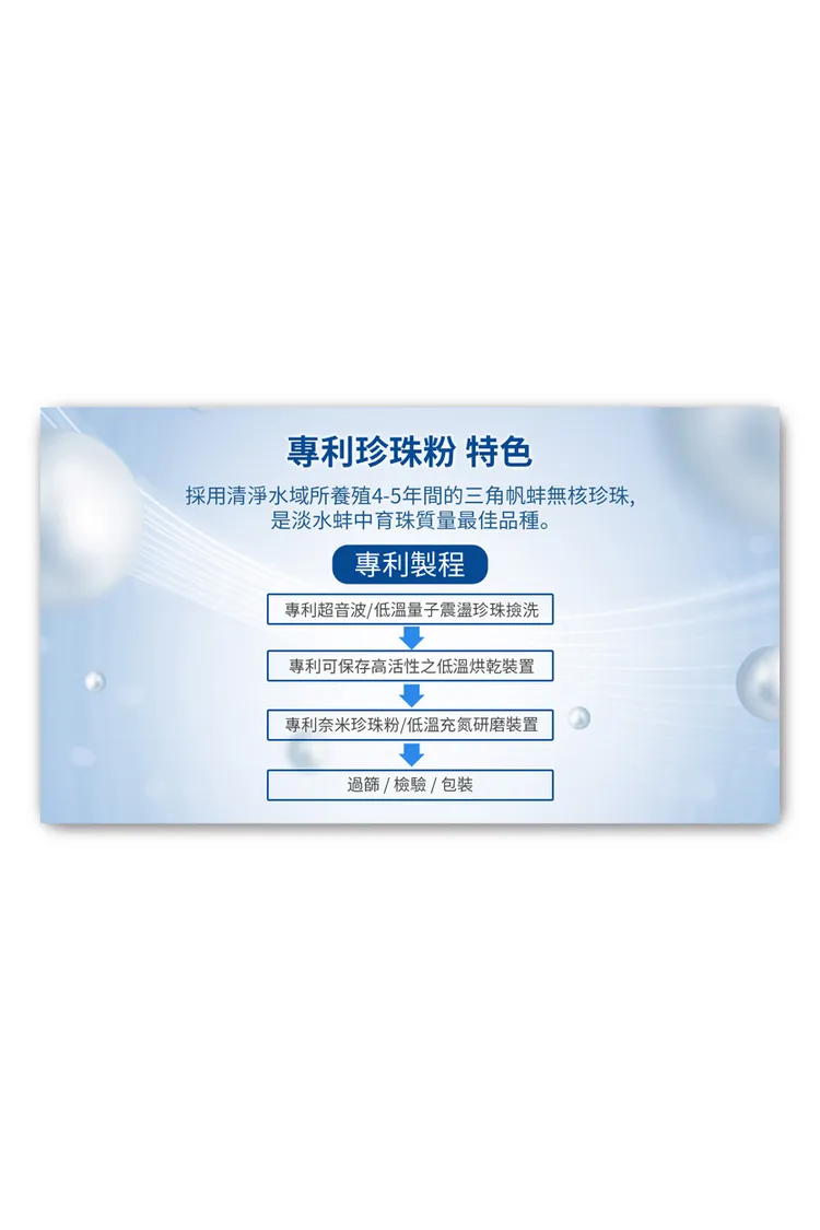 專利極研(奈米級)珍珠粉 / 尖端製成領先全球獨家研發 / 全程低溫完整保留營養精華 / 獨家嚴選三角帆蚌無核珍珠