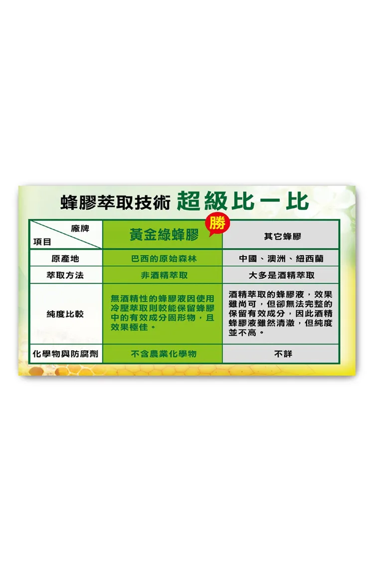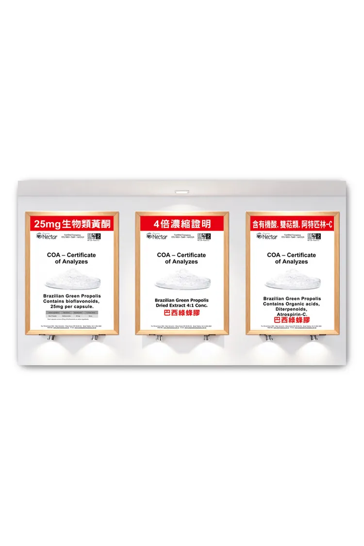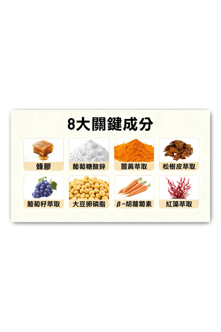 蜂膠、葡萄糖酸鋅、薑黃萃取、松樹皮萃取、葡萄籽萃取、大豆、卵磷脂、β-胡蘿蔔素、紅藻萃取